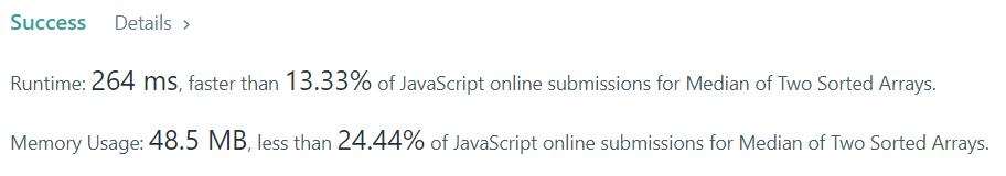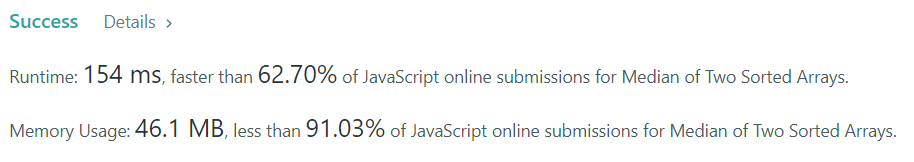 ๋‘ ๋ฐฐ์—ด์„ ๋ณ‘ํ•ฉํ•˜์—ฌ sort๋ฅผ ์‚ฌ์šฉํ•˜๊ณ  mid Index๋ฅผ ๊ตฌํ•ด์„œ ํ•ด๊ฒฐํ•˜๋Š” ๋ฐฉ๋ฒ•์ด ์‰ฝ๊ธด ํ•˜์ง€๋งŒ JS์˜ ๊ธฐ๋ณธ sort ๋ฉ”์„œ๋“œ๋Š” nlog(n)์˜ ์‹œ๊ฐ„๋ณต์žก๋„๋ฅผ ๊ฐ–๋Š”๋‹ค.